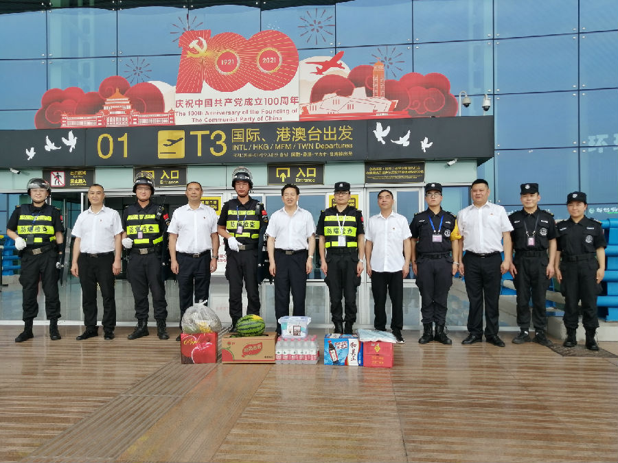 6月24日,集團公司黨委委員、監(jiān)事長孫世昌一行代表集團公司黨委到忠信公司機場執(zhí)勤點慰問,為一線隊員送去水果、飲料、礦泉水等防暑降溫物品,并致以親切的問候。