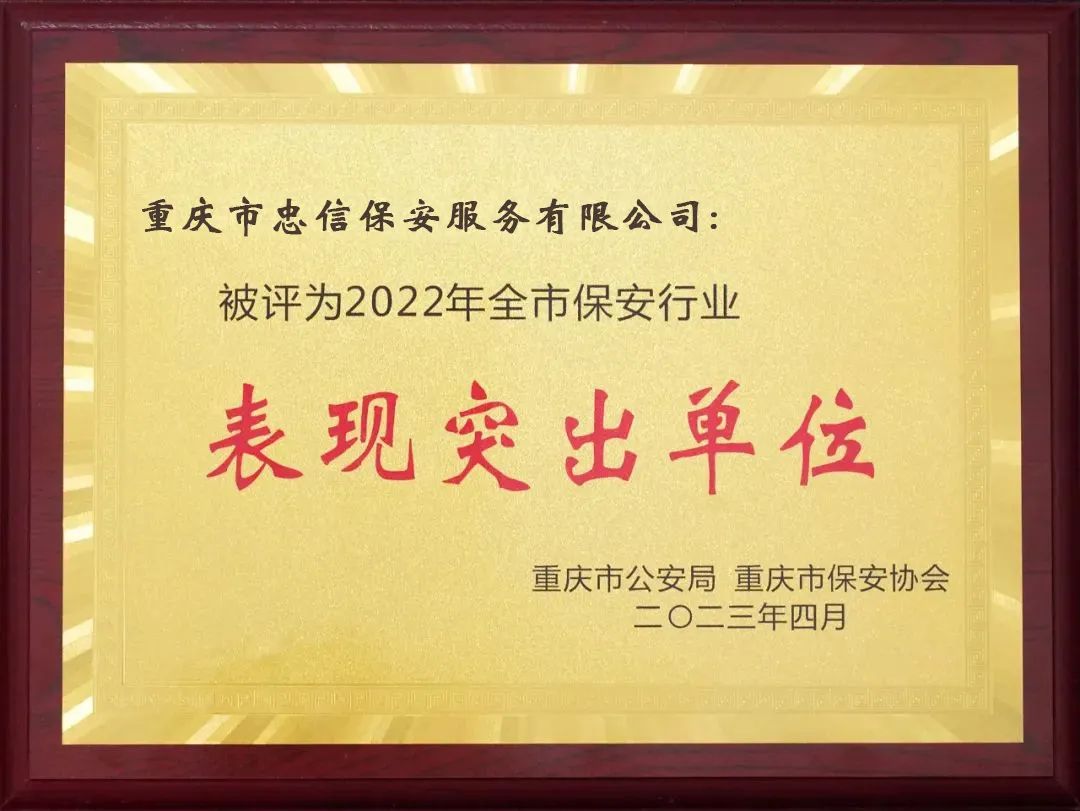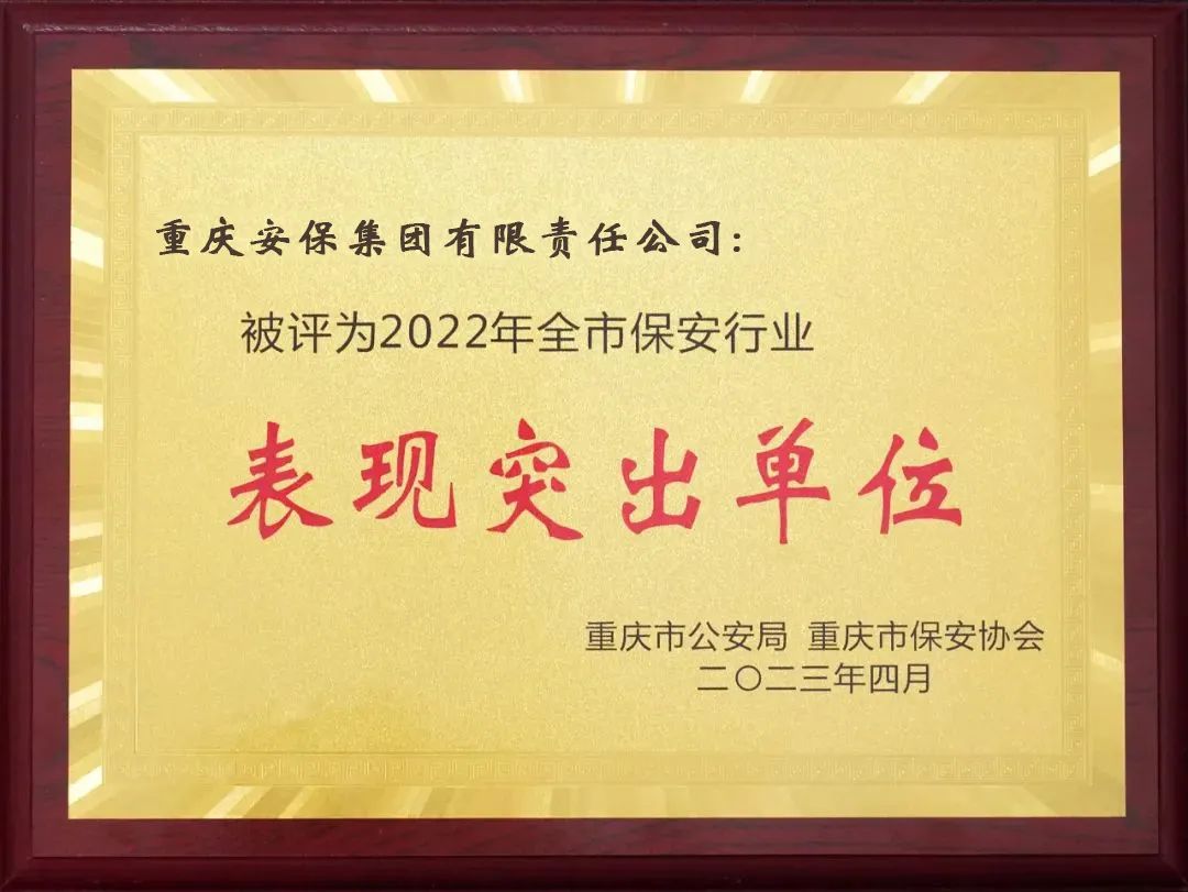 2023年4月14日,重慶市公安局、市保安協(xié)會聯(lián)合組織召開了“2022年度重慶市保安行業(yè)工作總結大會”,重慶安保集團與重慶安保集團忠信保安服務公司榮獲“重慶市2022年全市保安行業(yè)表現(xiàn)突出單位”稱號,同時,張杰、張亮、王磊等共計8名集團安保隊員被評為“2022年全市保安行業(yè)表現(xiàn)突出保安員”。